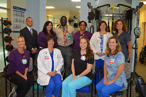 PHOTO: Front Row (left to right): Karen Fletcher, RT; Mary Bahen, RN, CCRP, coordinator, cardiac and pulmonary rehabilitation; Rhiannon Shenk, CEP; Meg Ims, RN. Second Row (left to right): Anthony Bladen, vice president of operations; Heather Wright, BS, RRT, director, cardiac and pulmonary rehabilitation; Dr Samuel Foster, medical director, cardiac and pulmonary rehabilitation; Edwina Johnson, RT; Kelly Brogan, RN; Jennifer Lundeen, cardiac rehab tech, personal trainer. Not pictured, Cortney Yeatman.