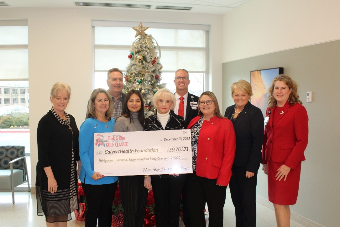 Members of The Cannon Club Pink and Blue Committee presented a check to the CalvertHealth team from annual golf classic.